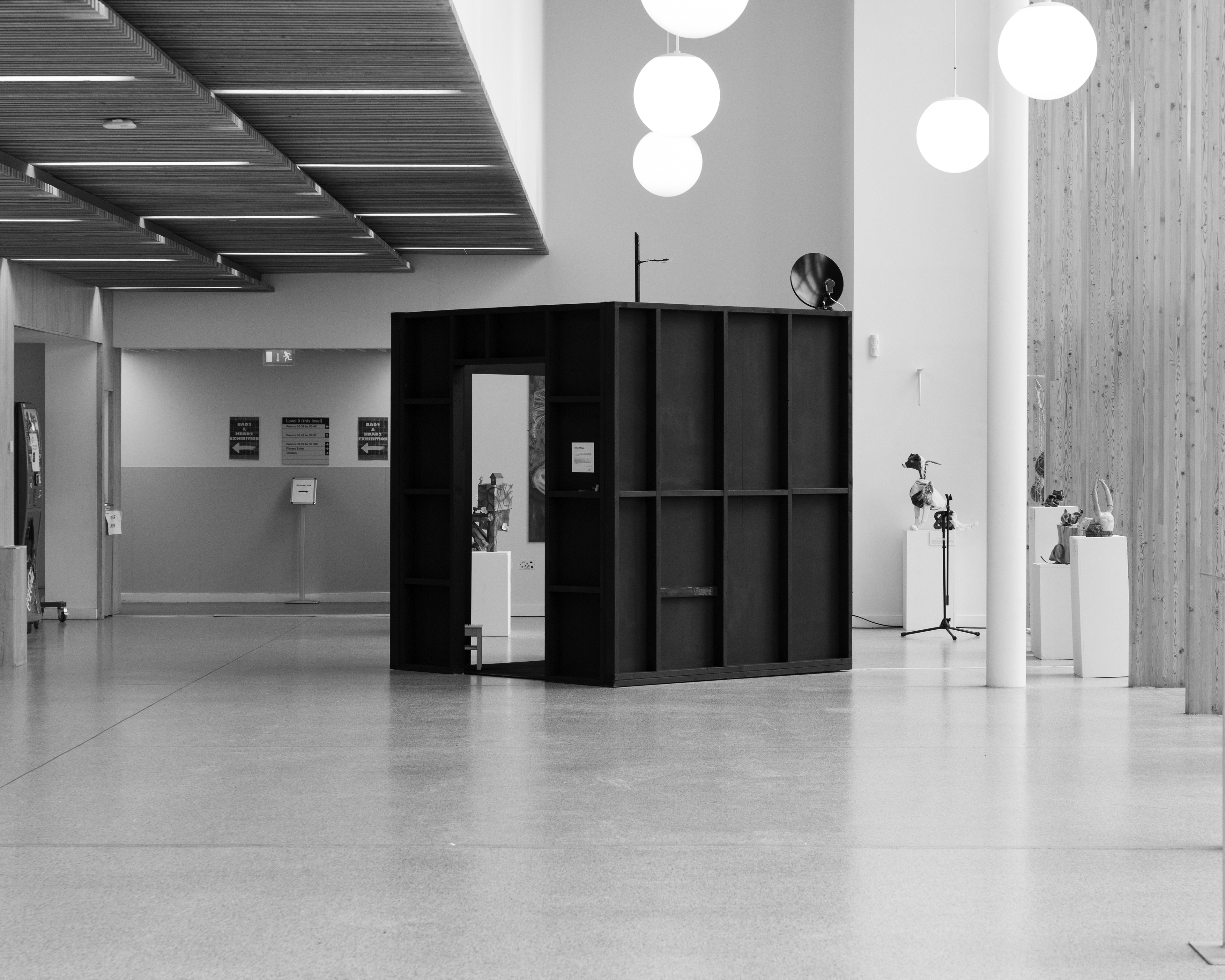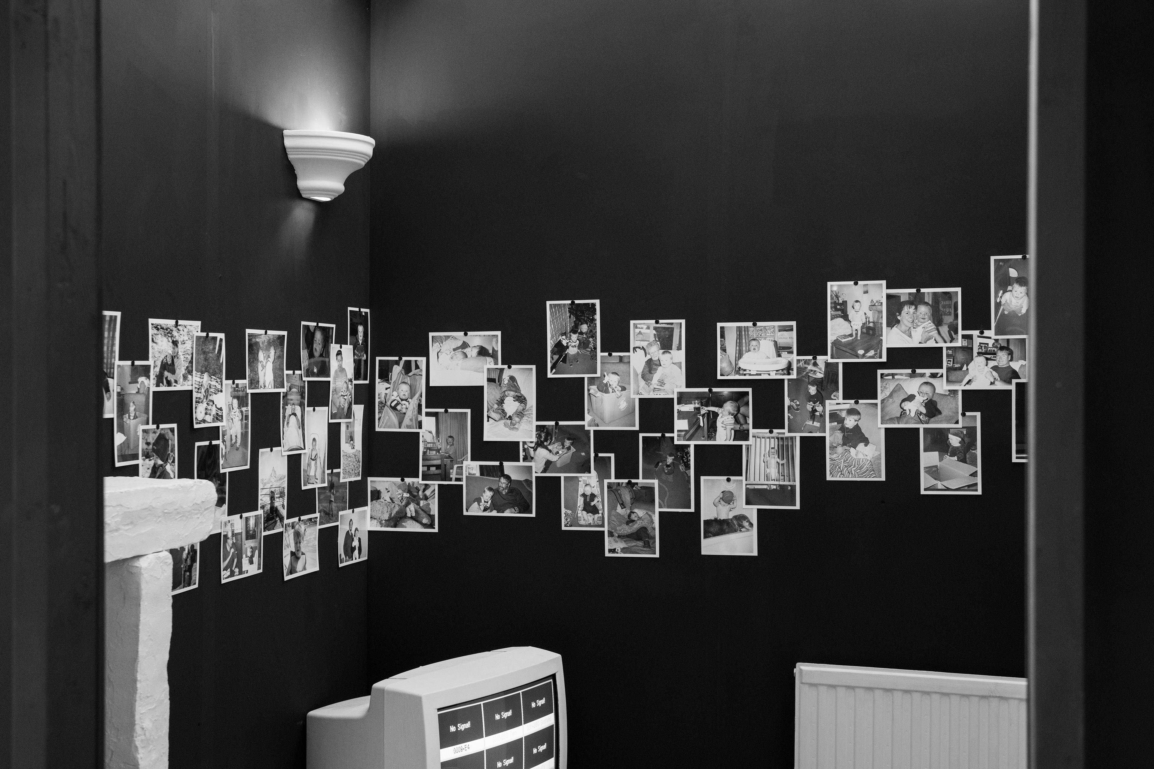 Installation recreating the artists' childhood living room in black and white with hand printed black and white photographs from colour negatives